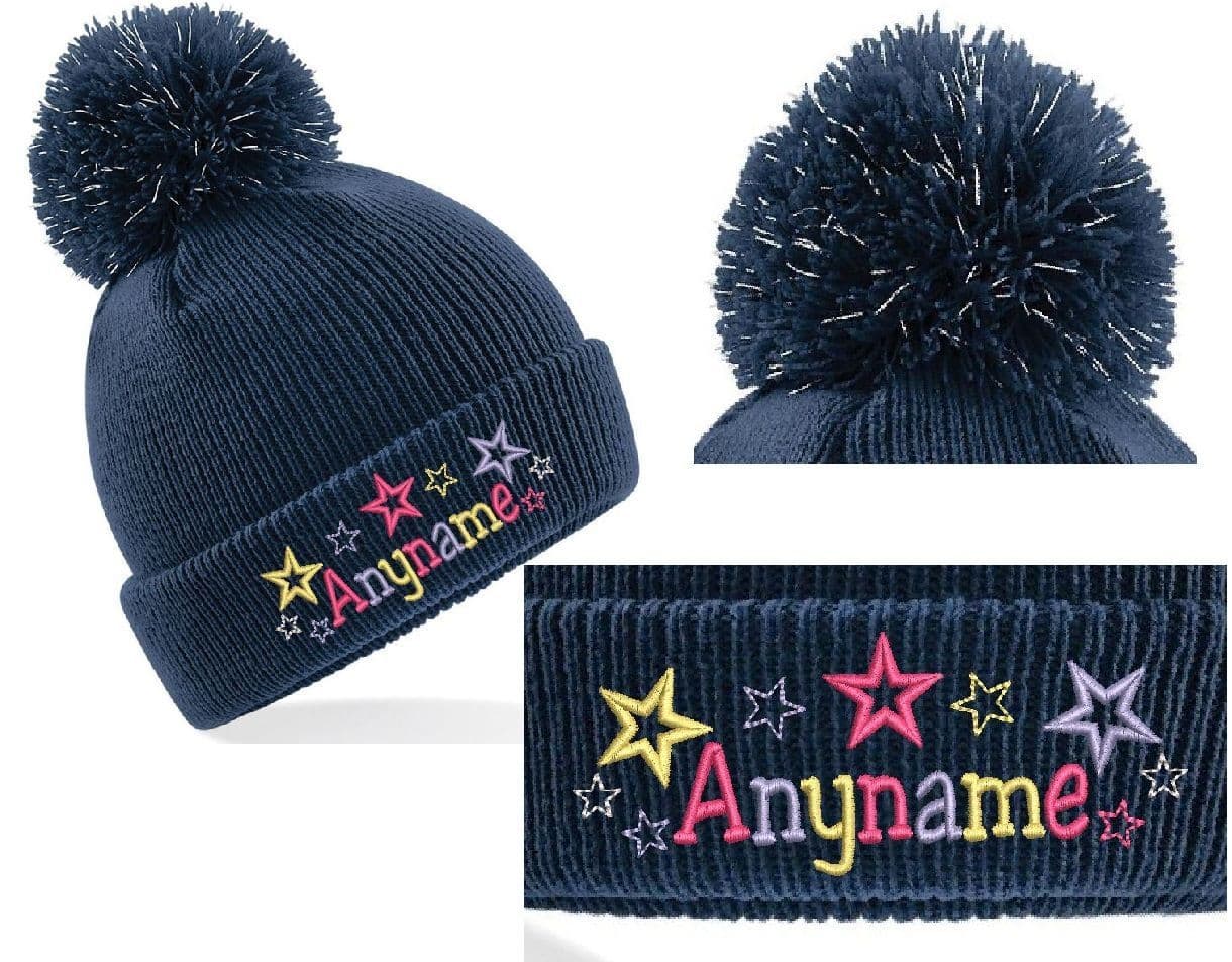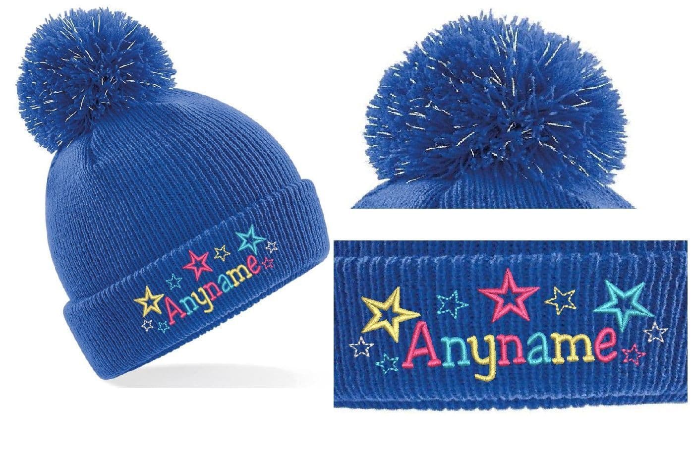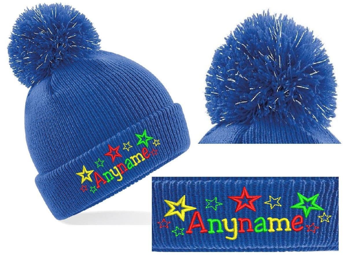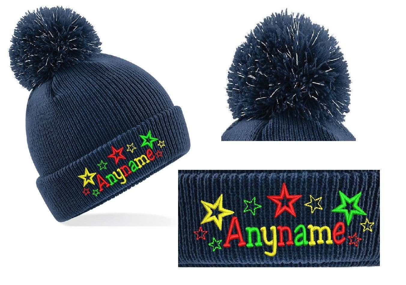 Kids light reflective Bobble hat. Embroidered with Bright coloured star design Personalised with any name!