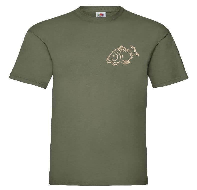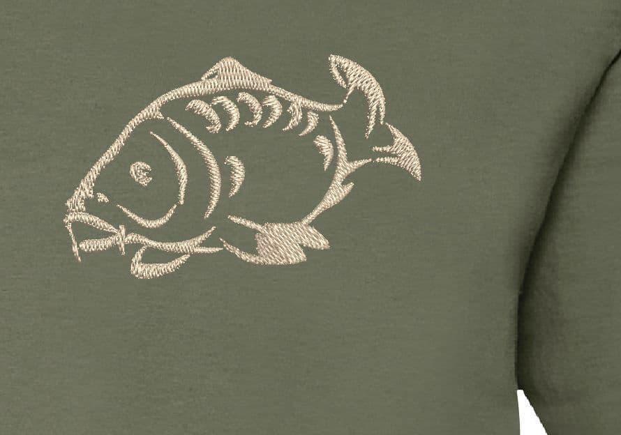 CARP FISH EMBROIDERED IN STONE/SAND COLOURED EMBROIDERY THREAD TO FRONT LEFT CHEST AREA.